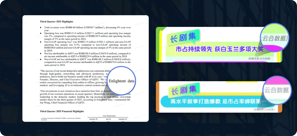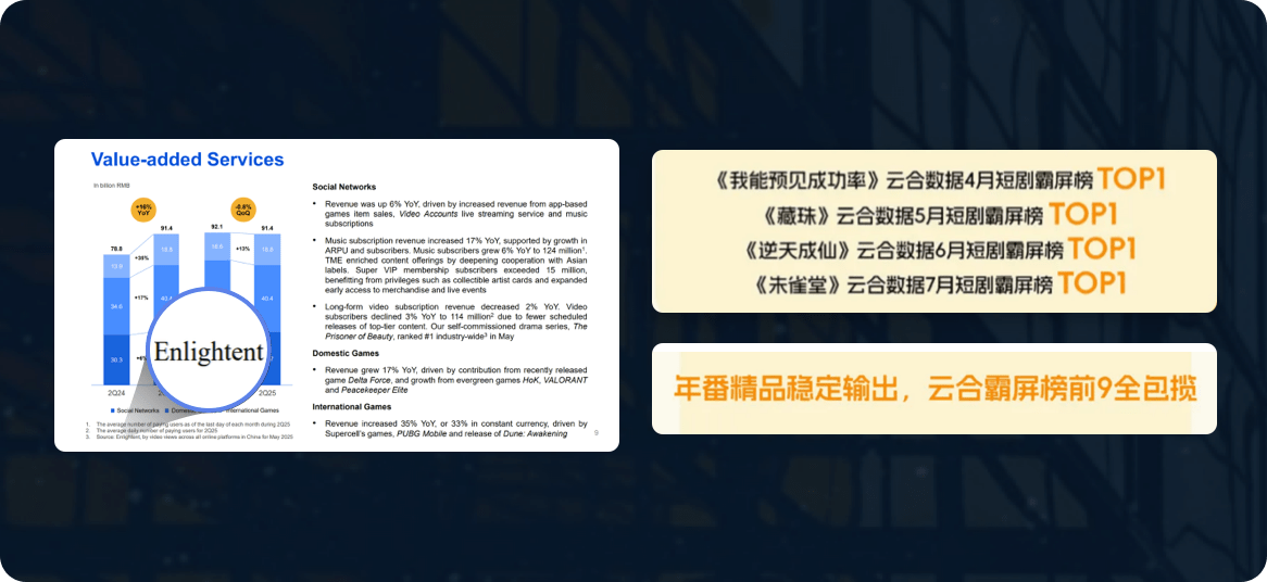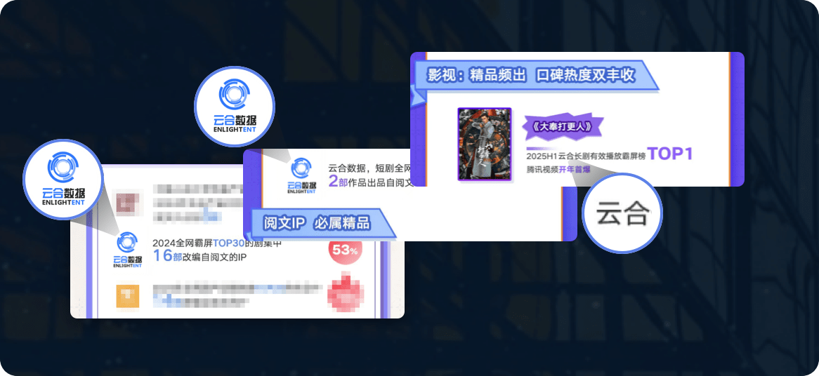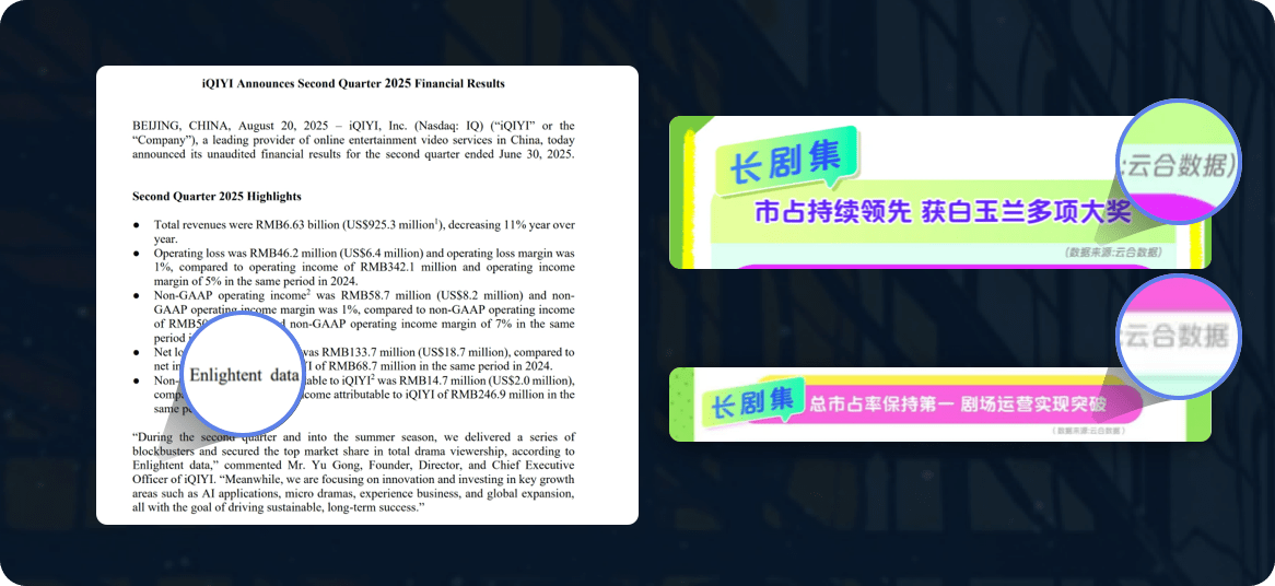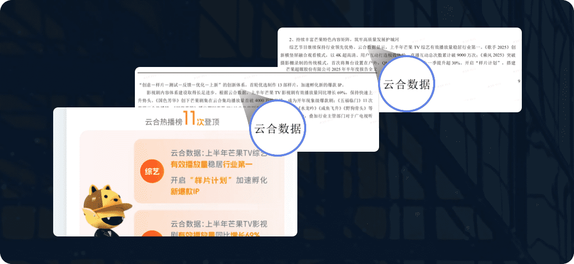 “云合数据可以隔天输出全网节目播放数据,行业最快,比同类产品提前两周,帮助我们 及时调整排播方案”