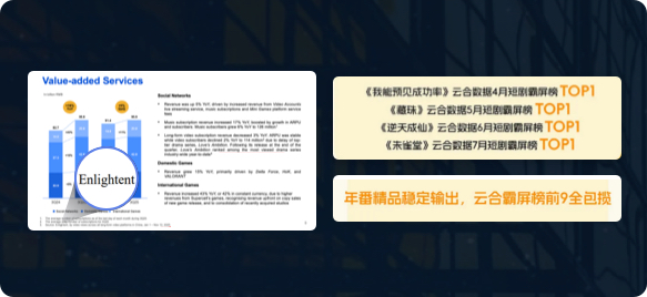 “云合数据已成为行业通行语言,A、B、M、Y、Z 等视频平台均通过云合数据进行市场、 竞品、内容分析;各广告主已经使用云合数据判断节目的实际播放量;券商分析师、行业 报告也援引云合数据进行分析;我们已经顺利拿下了,《九重紫》和《漂白》,这里面都有 云合数据的功劳!”